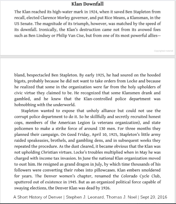"The Klan reached its high—water mark in 1924, when it saved Ben Stapleton from recall, elected Clarence Morley governor, and put Rice Means, a Klansman, in the US Senate. The magnitude of ts triumph, however, was matched by the speed of its downfall. Ironically, the Klan‘s destruction came not from its avowed foes such as Ben Lindsey or Philip Van Cise, but from one of ts most powerful allies— bland, bespectacled Ben Stapleton. By early 1925, he had soured on the hooded bigots, probably because he did not want to take orders from Locke and because he realized that some in the organization were far from the holy upholders of civic virtue they claimed to be. He recognized that some Klansmen drank and gambled, and he knew that the Klan—controlled police department was hobnobbing with the underworld.